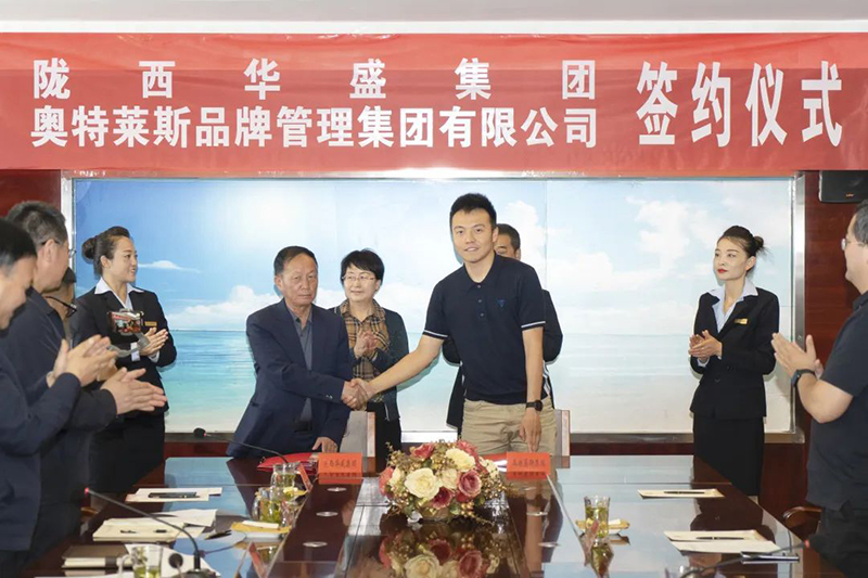 奧特萊斯(中國)業(yè)務(wù)拓展中心總經(jīng)理左祺與隴西華盛集團(tuán)董事長柴彥章代表雙方公司簽署合作協(xié)議。