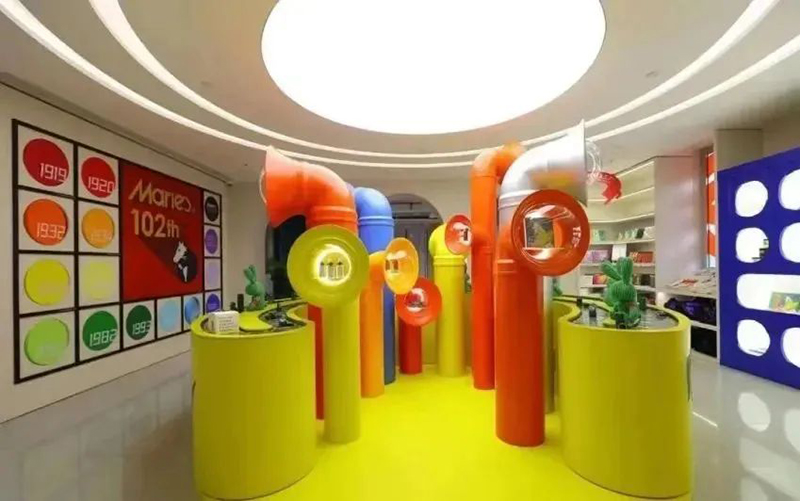 Mamǎfufú將“小紅閑”這一概念發(fā)揮得淋漓盡致,無(wú)論是整體的場(chǎng)景風(fēng)格,對(duì)于色彩的靈活運(yùn)用,還是互動(dòng)體驗(yàn)的內(nèi)容和品牌首店引入,都創(chuàng)造了極高的出片效果,吸引眾多年輕人前來(lái)打卡消費(fèi)。Mamǎfufú超級(jí)百貨是一個(gè)跨界聯(lián)合的潮流文創(chuàng)空間,占據(jù)了M+馬利位置最好的沿街二樓,無(wú)論室外的墻體,還是室內(nèi)的布置,均大面積運(yùn)用了極具張力的紅黃藍(lán)三原色,將“馬利”這個(gè)百年顏料品牌的“色彩主義”貫穿于整體空間設(shè)計(jì)中。1000㎡的空間內(nèi)營(yíng)造了8個(gè)主題區(qū)域,設(shè)置馬利趣味工廠、馬利畫材、POP-UP Market、色彩理想國(guó)、靈感書集、色彩生活集市、色彩沙龍等主題區(qū)域,涵蓋藝術(shù)展覽、手工工作室、畫材、圖書、生活家居、藝術(shù)衍生、服裝零售等多種業(yè)態(tài)內(nèi)容。