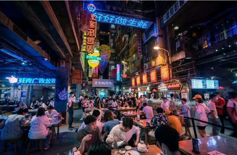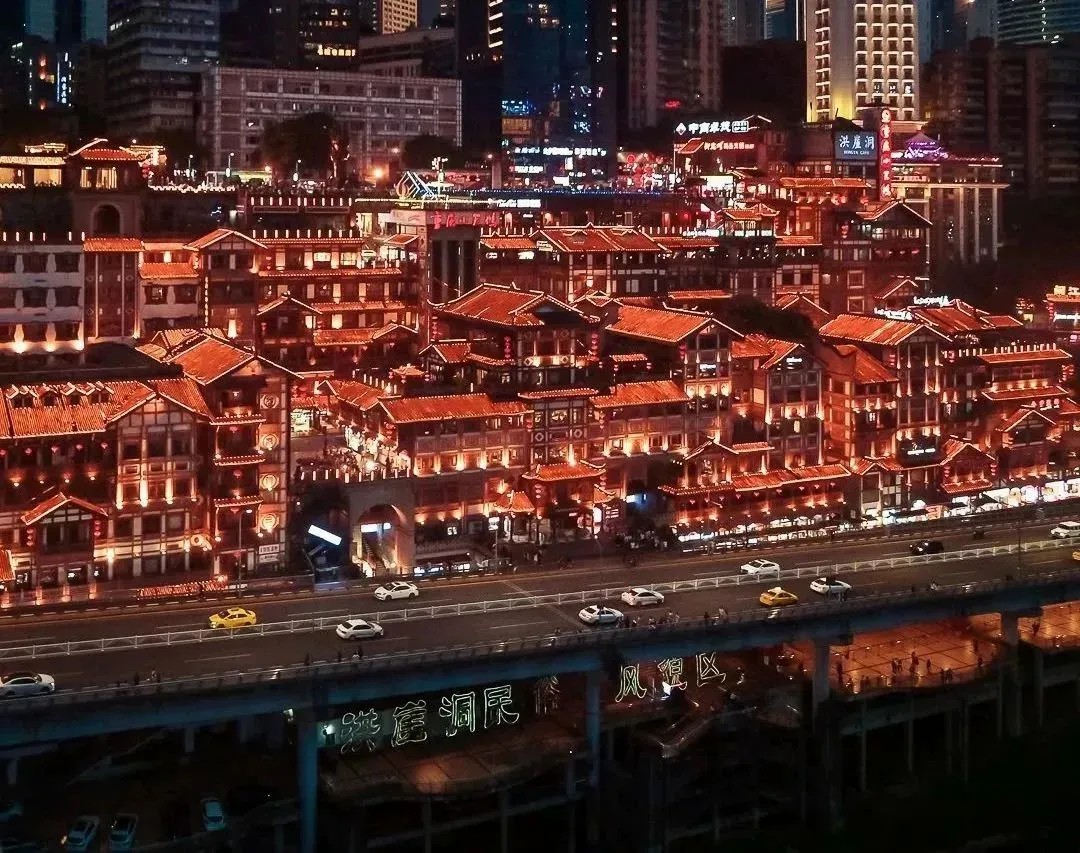 憑借巴渝傳統(tǒng)特色建筑的吊腳樓,光怪陸離的夜景,以及媲美《千與千尋》的二次元的視覺呈現(xiàn),在開街10年后進(jìn)入“黃金時(shí)代”,借助新媒體和IP話題發(fā)酵不斷攀升,發(fā)展成為如今的頂流的IP網(wǎng)紅地標(biāo)。