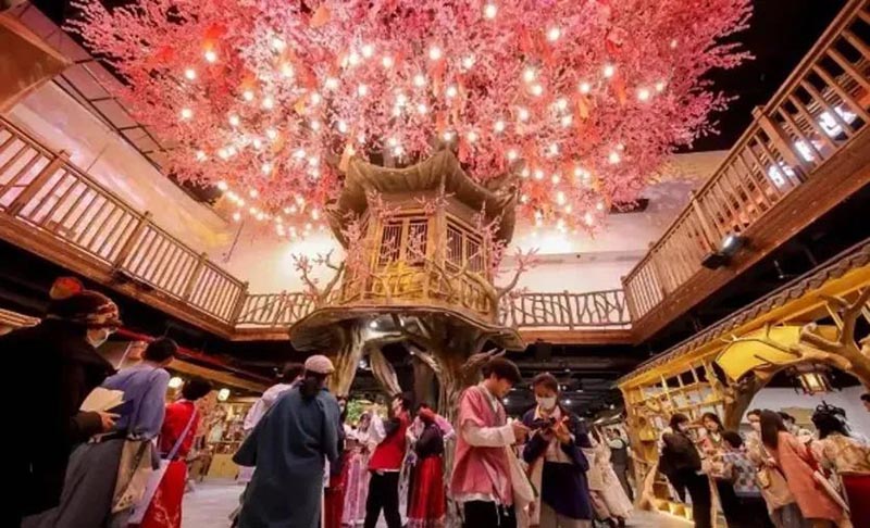 位于北京東三環(huán)富力廣場5層的大型沉浸式主題商業(yè)空間“戲精桃花源”,占地面積400多平方米,以桃花源為場景主題,在室內(nèi)打造了一個沉浸式娛樂休閑空間,將沉浸式場景、劇情演員、故事游戲、入駐店鋪,通過游戲串聯(lián)起來,消費者可以在真人NPC的互動和幫助下完成任務,在游逛的同時還完成了游戲體驗。