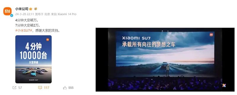 更令人矚目的是,新車在發(fā)布后僅4分鐘內(nèi)便突破萬輛大定,7分鐘內(nèi)更是飆升至2萬,上市短短27分鐘便鎖定了5萬臺(tái)訂單,完美詮釋了“上市即熱銷”的盛況,小米汽車也因此被賦予了繼特斯拉之后“新鲇魚”的稱號(hào),SU7更是成為了2024年汽車界萬眾矚目的焦點(diǎn)。