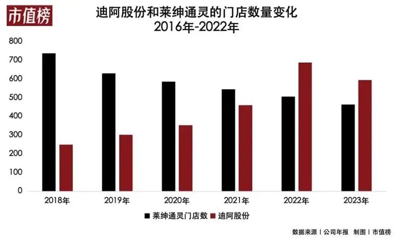 迪阿股份(股票代碼:301177),作為首飾市場中的一員,在“黃金熱潮”的沖擊下,已連續(xù)六個(gè)季度面臨營業(yè)收入與凈利潤的“雙重下滑”。2023年,其門店數(shù)量更是縮減了94家,降至594家,而萊紳通靈亦不例外,門店數(shù)量減少了44家,目前總數(shù)為463家。