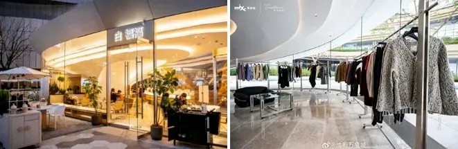 二者通過中間的三個(gè)異形玻璃盒子串聯(lián),分別進(jìn)駐了Snow Peak(西南首家購(gòu)物中心店)、ROARINGWILD成都首家限時(shí)概念店、中式茶飲品牌“白福福”,十分吸睛。