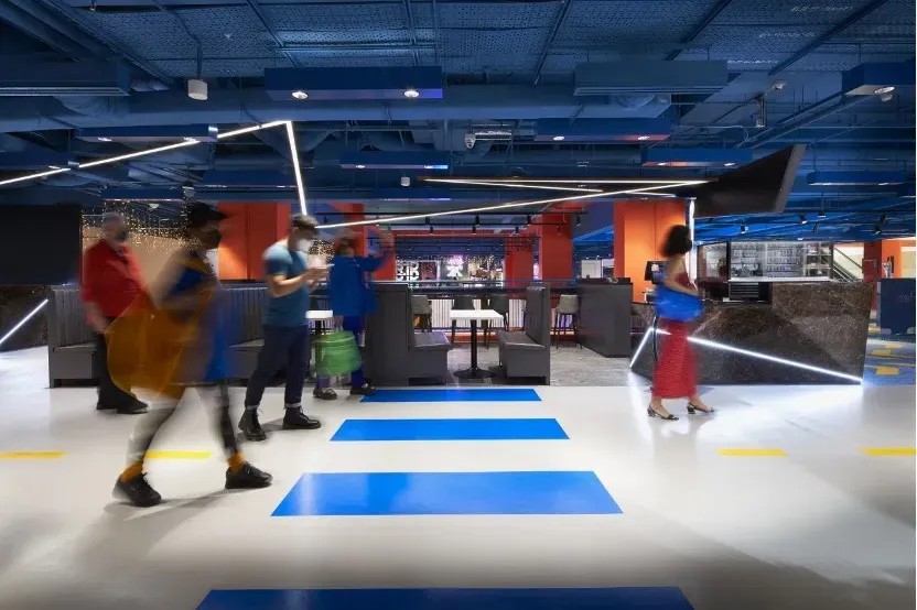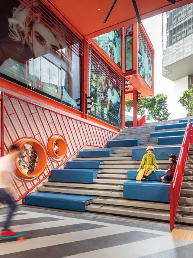 在空間優(yōu)化上,GRiD項目著重打造社交與活躍氛圍。通過引入“社交樓梯”理念,將傳統(tǒng)商鋪空間轉(zhuǎn)變?yōu)榧蓍e、交流與體驗于一體的多元功能區(qū)。這些設(shè)計不僅增強了建筑的視覺吸引力和可識別性,還以鮮明的橙色、藍(lán)色及白色調(diào),為空間注入活力與現(xiàn)代感,使其在城市街角中獨樹一幟。