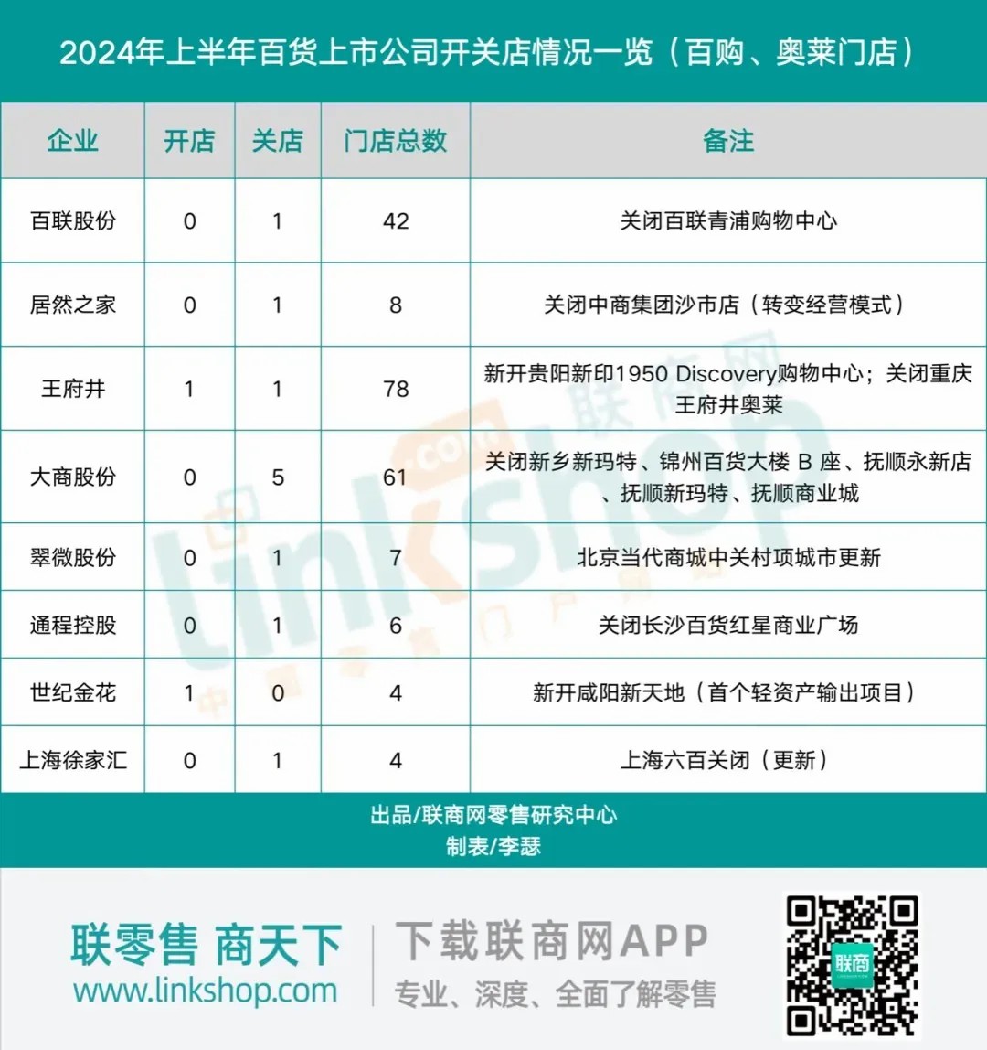 在門店的開(kāi)設(shè)與關(guān)閉動(dòng)態(tài)上,2024年上半年呈現(xiàn)出一個(gè)顯著的趨勢(shì):關(guān)店數(shù)量遠(yuǎn)超開(kāi)店數(shù)量。具體而言,44家百貨上市公司在此期間僅新增了2家門店(此數(shù)據(jù)僅限于百貨商店、購(gòu)物中心及奧特萊斯門店),而關(guān)閉的門店數(shù)量則達(dá)到了11家。與之形成對(duì)比的是,去年同期這些公司開(kāi)關(guān)店的數(shù)量均為5家。這一變化表明,與去年相比,百貨上市公司在開(kāi)設(shè)新店方面變得更加謹(jǐn)慎,而關(guān)閉門店的速度卻在加快。