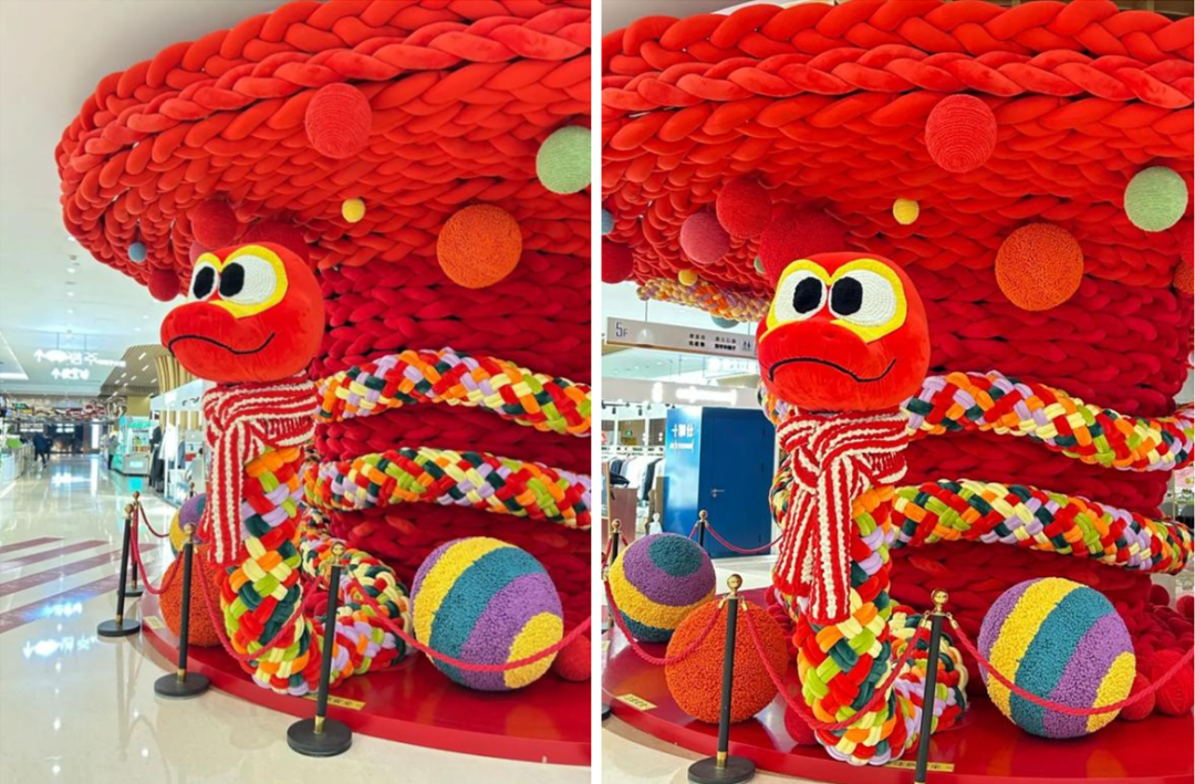 在即將到來(lái)的蛇年,購(gòu)物中心開(kāi)始陸續(xù)安排上了蛇年美陳。北京世紀(jì)金源購(gòu)物中心也不例外。它選擇將毛線與蛇元素相結(jié)合,帶來(lái)一棵神蛇許愿樹(shù)。整棵樹(shù)都由毛線編織纏繞而成,五彩斑斕的神蛇盤繞許愿樹(shù),還給自己帶上了一條圍巾,略顯可愛(ài),也不失喜慶的氛圍。