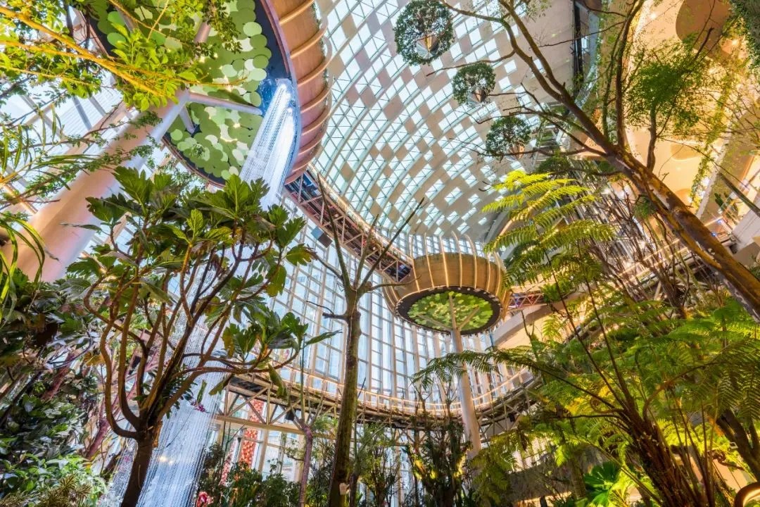 以“一日微度假勝地”為定位的上海南翔印象城MEGA,不僅融合了多元業(yè)態(tài),還巧妙地融入了植物園等自然生態(tài)元素。在建筑設(shè)計(jì)上,其外立面以“梯田山丘”為靈感,打造出上海罕見的退臺(tái)花園;在商場(chǎng)內(nèi)部,創(chuàng)造性地引入了森林、濕地等自然景觀,構(gòu)筑了一座占地約600平方米、高達(dá)5層、擁有200多種國內(nèi)外植物的跨層生態(tài)植物園。